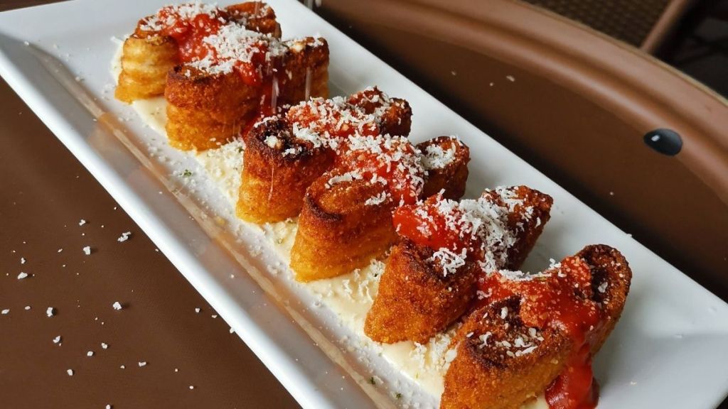 Después por la consistencia: son láminas de lasagna realmente fritas, acompañadas con salsa bolognesa y por supuesto queso.